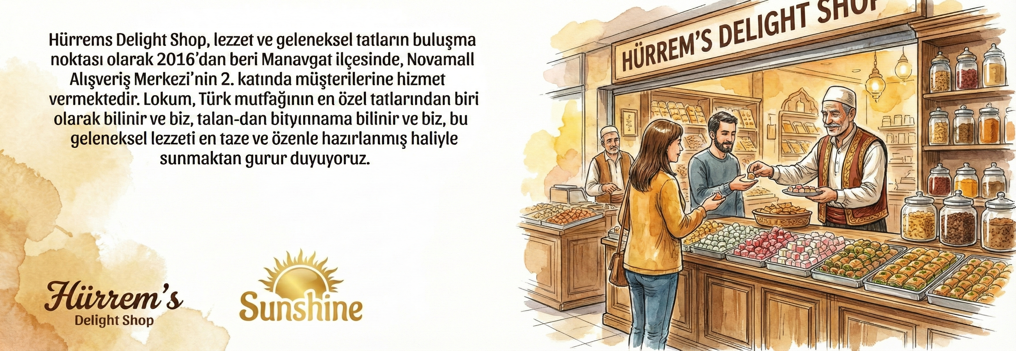 Hürrems Delight Shop, lezzet ve geleneksel tatların buluşma noktası olarak 2016'dan beri Manavgat ilçesinde, Novamall Alışveriş Merkezi'nin 2. katında müşterilerine hizmet vermektedir. Lokum, Türk mutfağının en özel tatlarından biri olarak bilinir ve biz, bu geleneksel lezzeti en taze ve özenle hazırlanmış haliyle sunmaktan gurur duyuyoruz.
